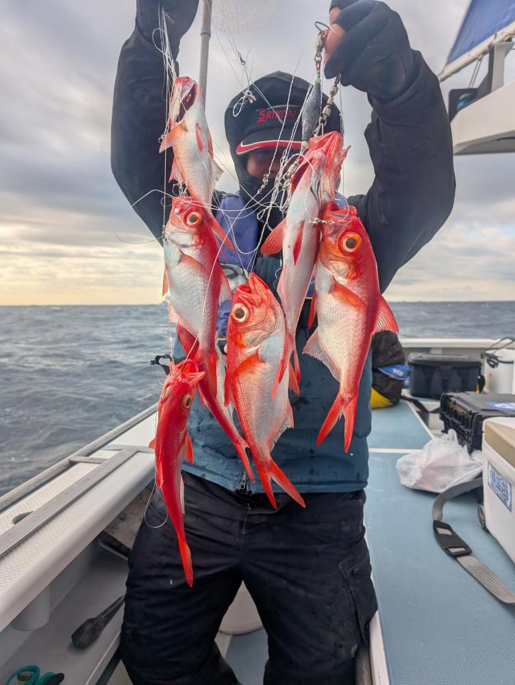 キンメダイ皆さんにアタリよく、良型クロムツも交じり寒い1日でしたが皆さん頑張って頂きお土産できました