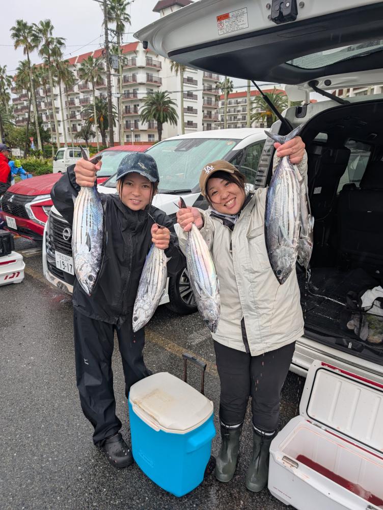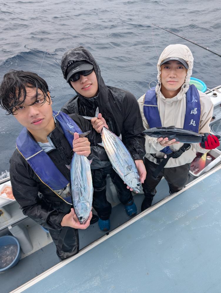 出船して少したつとポツポツと雨が降り始め寒い1日でしたが、皆様頑張って頂きカツオはポツポツとアタリ、マグロ狙いの方は水面バラシやサメに喰われ(`;ω;´)ハリ外れなどあり10打数2.5安打で18kg・26kg・28kgゲット!!!!